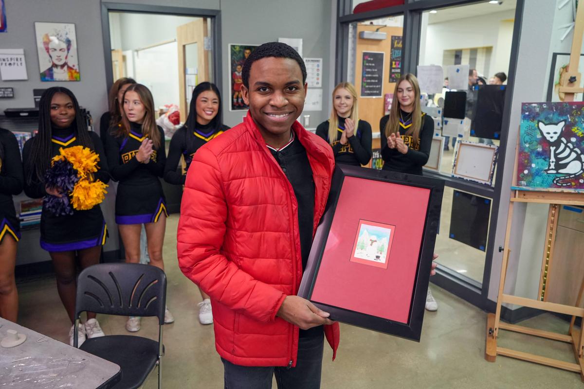 -Pieper High School Principal Lauran Knight presented 11th-grade student Ashton Dunbar with his framed entry which was the high school winner of Comal ISD’s 3rd Annual Christmas Card Contest.