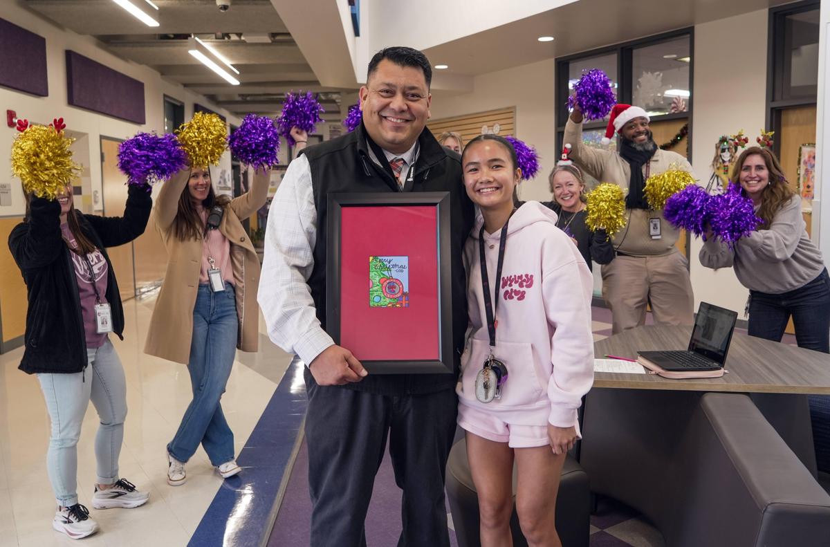 -Pieper Ranch Middle School Principal Tony Trevino presented 5th-grade student Jenny Le with her framed entry which was the overall winner of Comal ISD’s 3rd Annual Christmas Card Contest.